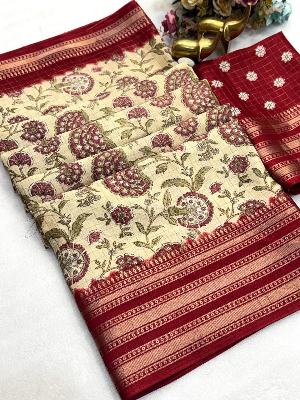 *FABRIC-: MASSMELLO WEAVING JARI CHEX WITH HEAVY JEQ BORDER Floral PRINT SAREE **