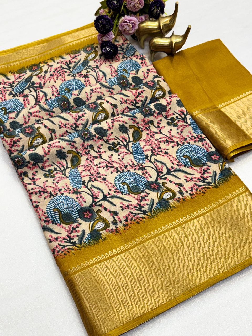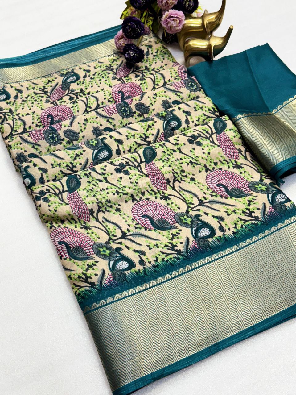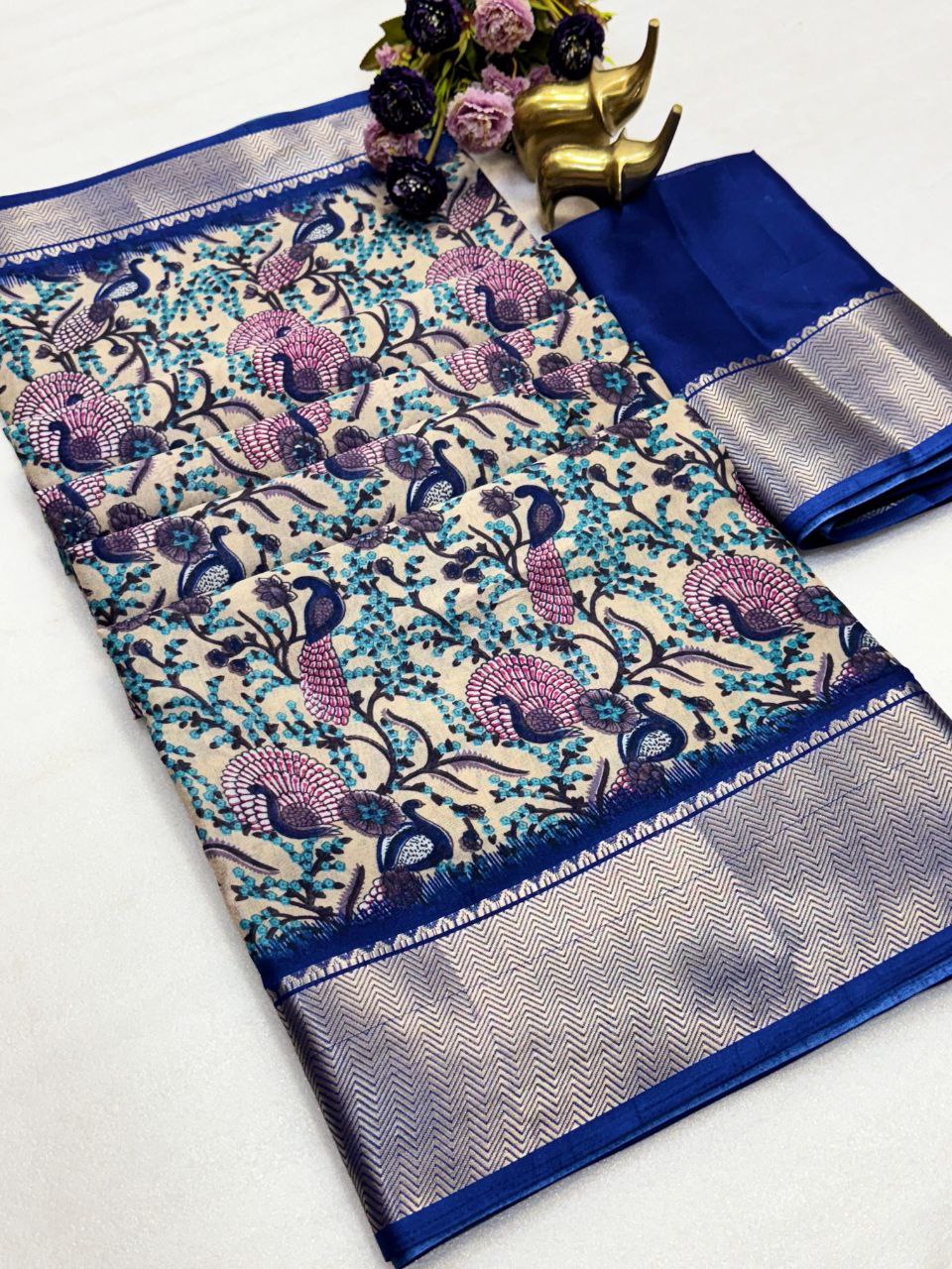 Beautiful Dola silk sarees KALMKARI print along with zari border
